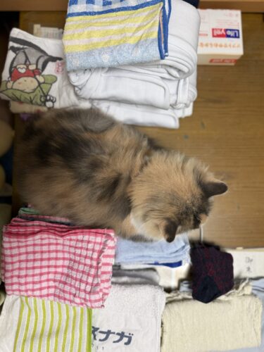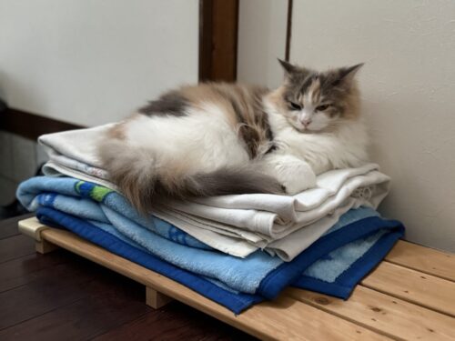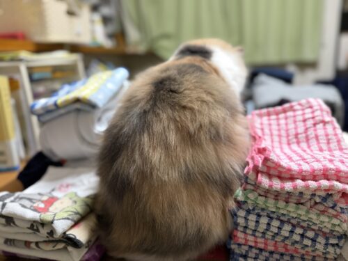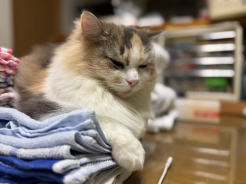 3. 洗濯物たたんでいる気になるサイベリアンモカちゃん🐈